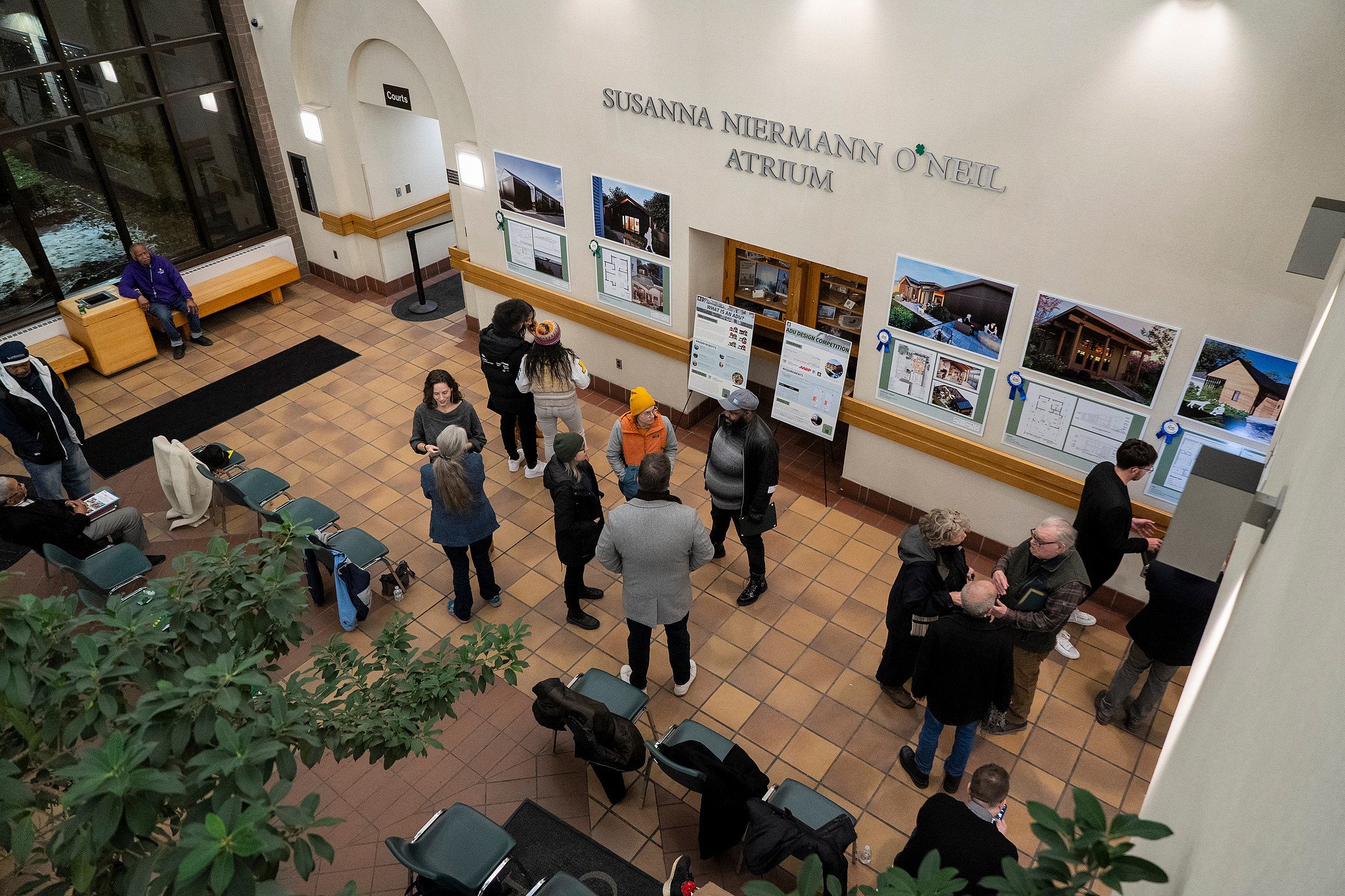 Converted the atrium into a walkable exhibition using large-format prints of the winning ADU designs.